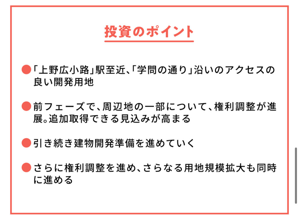 - 周りの土地も追加で取得できそうで、プロジェクトの規模が広がり収益の可能性もアップ。
