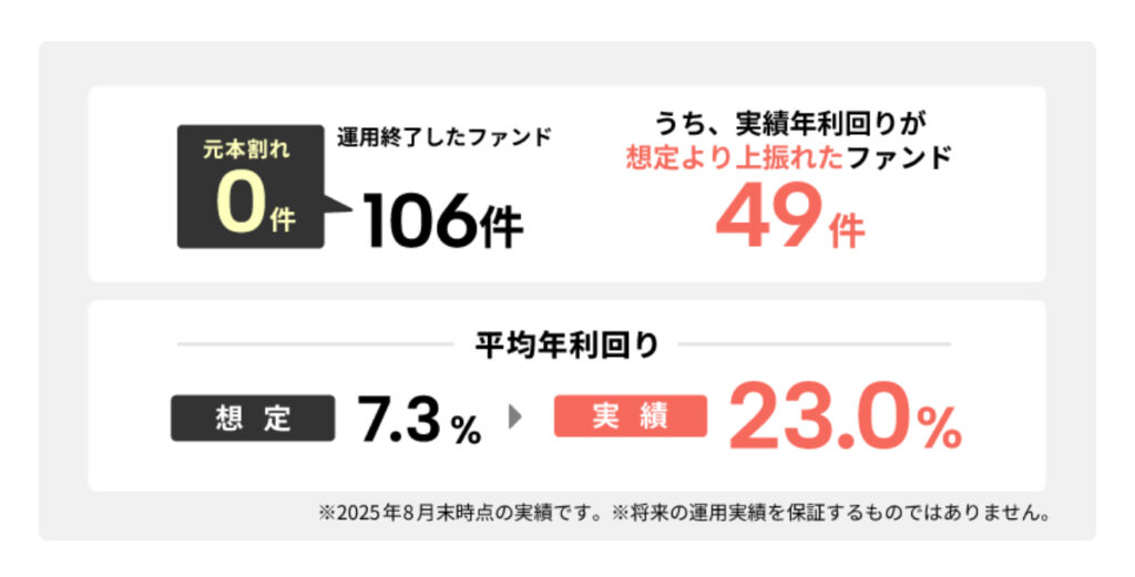 ・これまで終了した106ファンドで、元本割れは一度もなし。しかも49件は想定を超える利回りを実現。平均利回りは想定7.3% → 実績23.0%と大きなプラス!